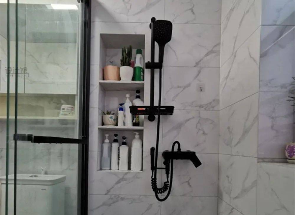此外,卫生间和阳台的下水管可封管做壁龛,用瓷砖包裹管道,在侧面留出1-2个壁龛,摆放洗发水、沐浴露或洗衣用品,不占地面空间,还能提升美观度。