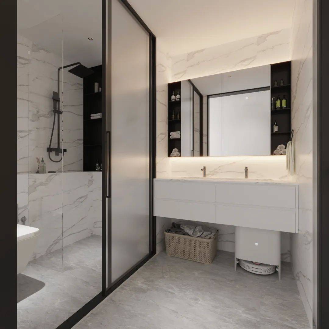 三分离即把洗手台、马桶、淋浴区彻底分开,可利用玻璃隔断、浴帘或半墙实现分区,各个空间互不干扰,早上家人可同时洗漱、如厕,不用排队等待。
