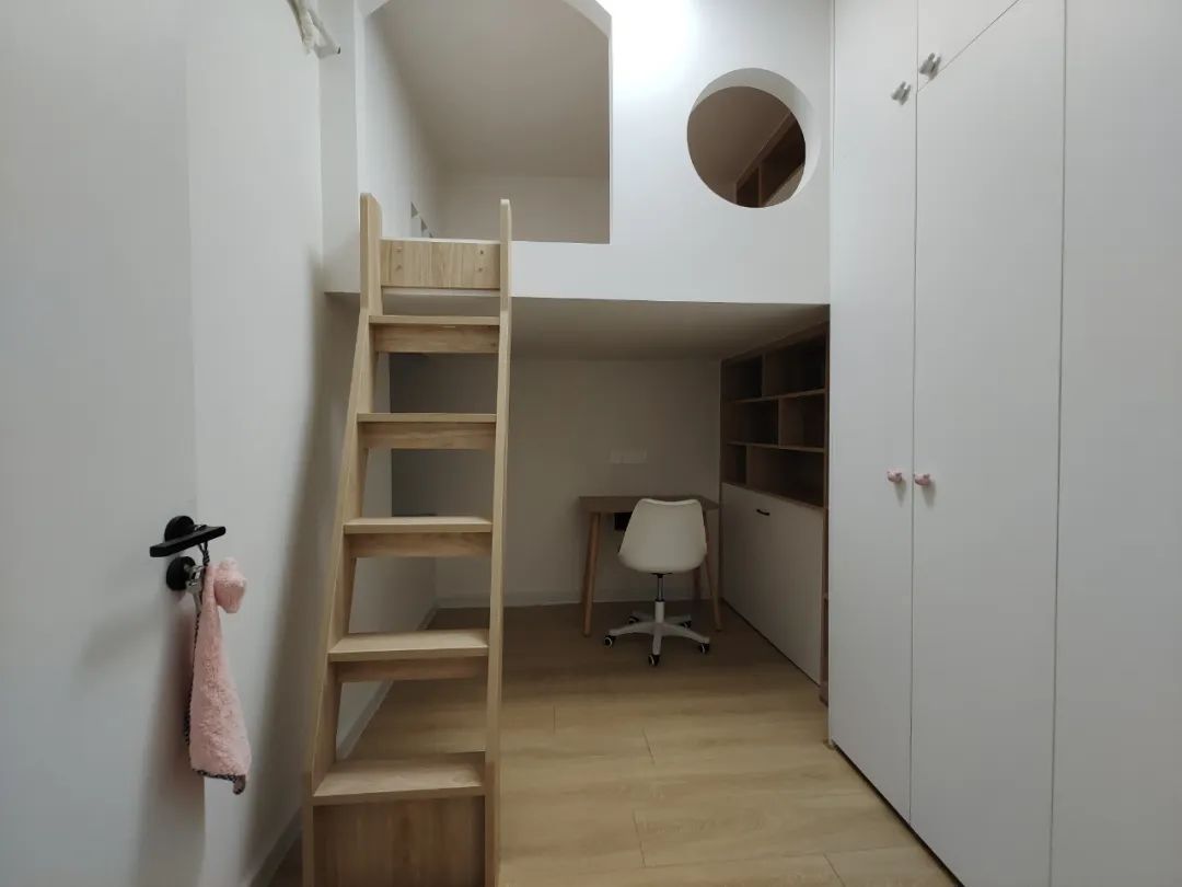 卧室可做半高床或高架床,床下方空间做成收纳柜、书桌或休闲区,比传统卧室节省50%的面积。