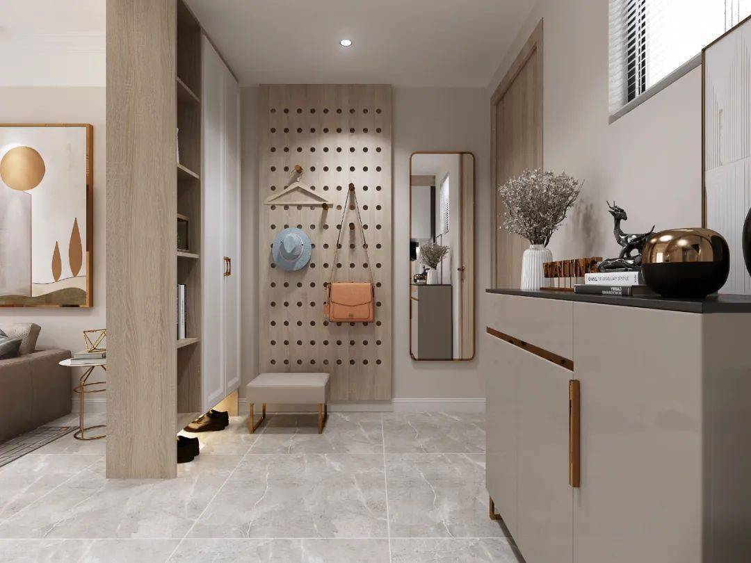 比如厨房墙面可装挂,挂起锅铲、勺子、抹布等小物件,不占用台面空间;玄关做洞洞板,不到1平米的空间,解决包包、钥匙、外套等收纳问题。